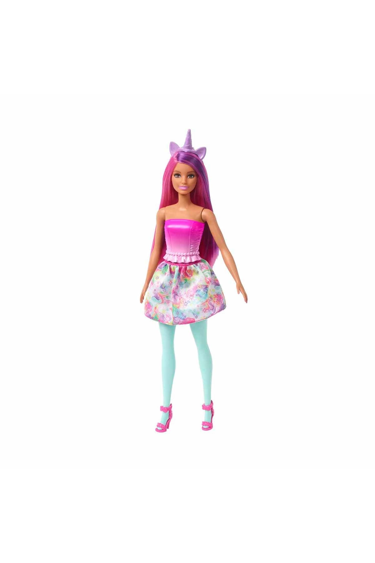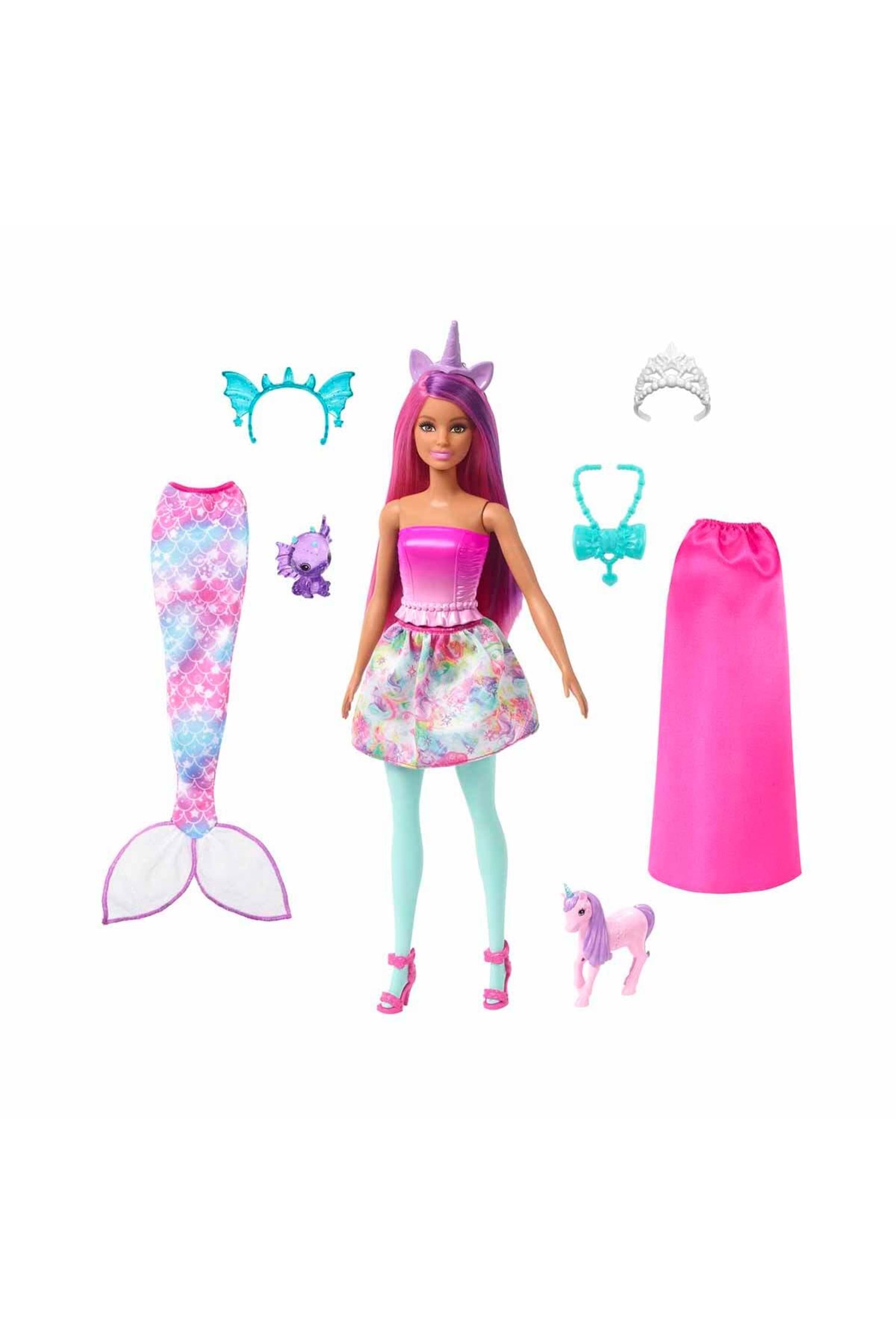 Bu kostümlü Barbie bebek karadan denize ve havaya geçebileceğiniz oyunlar sunuyor. Sette deniz kızı kuyruğu, iki etek, taçlar ve bir kolye gibi birçok kıyafet ve aksesuar bulunur. Renkli Barbie masal serisi setinde daha fazla oyuna ilham olması için bir de yavru ejderha ve tek boynuzlu at var! Bebek tek başına ayakta duramaz. Renkler ve süslemeler çeşitlilik gösterebilir. Barbie oyun setlerinin masalsı dünyasında macera, masalsı kıyafetler ve tek bir parmak şıklatmasıyla değişen kombinlerle başlar. Çocuklar Barbie bebeği farklı tarzlarda giydirip değişim oyunları oynayabilir. Bebek, setten çıkan deniz kızı kuyruğuyla uyumlu ve renk geçişli bir korse, uzun prenses eteği ve daha kısa bir çiçekli bir etek giyer. Kendisi pembe ve mor masalsı saçını aksesuarlarla süslemeyi çok seviyor! Ejderhalı taç, tek boynuzlu taç, prenses taçları veya kolyelerden istediğiniz birini seçip bebeğe takabilirsiniz. Yavru tek boynuzlu at figürü ve yavru ejderha figürü bu fantastik sete macera ve dostluk katıyor. Çocuklar Barbie'lerini deniz kızı ve prenses gibi karakterlere dönüştürüp yaratıcılıklarını ortaya çıkararak yeni oyunlar keşfedebilir. Bu masalsı kostüm seti gibi başka büyülü hediye fikirleri için tüm Barbie bebek ve oyun setleri koleksiyonuna göz atabilirsiniz. Kutu ölçüsü: 30 x 8 x 3,6 cm