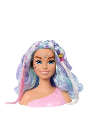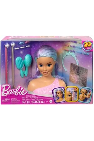 Barbie'nin Renkli Saçlı Büstü ve Aksesuarları HMD82 Çocuklar, Barbie Peri Masalı Şekillendirici Kafaları için saç modelleri oluştururken büyülü bir zaman geçirecekler. 20 ışıltılı aksesuarla fantastik bir güzellik stilisti olmak, bir asa sallamak kadar kolay! Barbie'nin pastel mavi ve lavanta tonlarında dalgalı fantazi saçları var. Büyüleyici updos ve örgülerden rengarenk dekore edilmiş görünümlere kadar, stil potansiyeli sınırsızdır. İki yıldızlı toka, üç inci toka, 11 değerli taş klips ve aydan ilham alan bir kafa bandı ile aksesuarlayın. Görünümünü özelleştirmek için ürünle birlikte verilen ışıltılı çıkartma sayfasını kullanın. Yüzünde fantastik tasarımlar yaratın veya yakasına, fırçasına ve daha fazlasına ışıltı katın! İki saç uzatma, sayısız stil olasılığı için ışıltılı renk patlamaları ekler. Hatta çocuklar uzantıları, klipsleri ve tokaları kendileri takabilirler!
