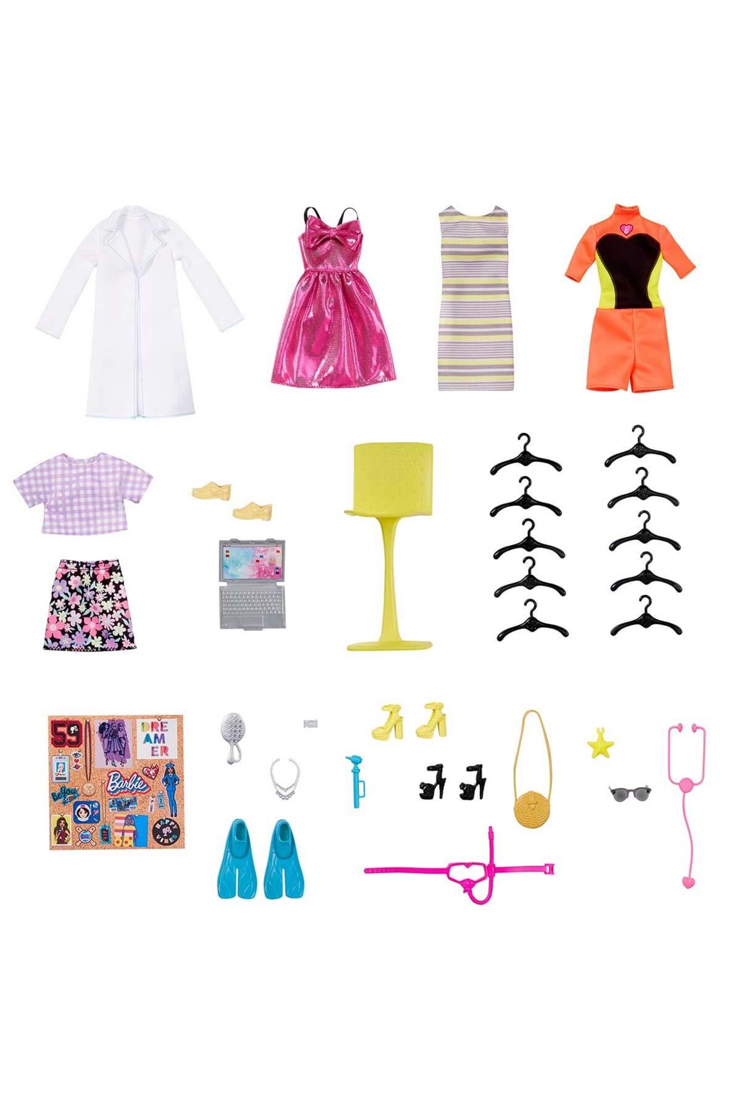 Barbie ve Rüya Gardırobu gittiğiniz her yerde benzersiz görünümler ve hikayeler yaratmanız size için ilham verir! Açıldığında 60 cm'den fazla genişliğe sahip olan bu modern dolapta 10'dan fazla saklama alanı, döner giysi askısı, tam boy ayna ve masa alanı bulunur. Oyun setine Barbie bebek ile birlikte 25'ten fazla giysi ve aksesuar dahildir. Çekmeceleri, rafları ve giysi askılarını kullanarak bu parçaları dilediğiniz gibi düzenleyebilir veya sergileyebilirsiniz. Döner elbise askısı gerçekten dönüyor. Kapı kolunu çevirerek askıyı döndürüp kıyafetinizi seçebilirsiniz. Bebek standı ve aynayı kullanarak kombinler yapabilir, masa alanı ve aksesuarları kullanarak ise yeni hikayeler yaratabilirsiniz. Oyun setine dahil olan çıkartma sayfasıyla masa üzerindeki mantar panoyu bile istediğiniz gibi kişiselleştirebilirsiniz. Gardırop oyun setinde aksesuarlar da dahil olmak üzere dört farklı tarzda görünüm yaratabileceğiniz kıyafet seçenekleri bulunur. Sade bir tarza uygun bir kıyafet, şık bir görünüme uygun bir kıyafet, çocuk doktoru olmak için bir kıyafet ve sporcu olmak için ise dalgıç kıyafeti! Çıkartma sayfasını çalışma alanını dekore etmek için de kullanabilirsiniz. İstediğiniz zaman dolabı toplamak ve kapısını kapatarak bir yere taşımak çok kolay! Tutma kolu taşımayı kolay hale getiriyor! Oyun setine Rüya Gardırobu, 1 adet Barbie bebek, üç ek kombin ve aksesuarlar dahildir. Barbie'nin Rüya Gardırobu açıldığında; 10'dan fazla eşya saklama alanı, döner giysi askısı, tam boy ayna, kişiselleştirilebilir masa alanı ve 25'den fazla giysi ve aksesuar ile 60 cm'den geniş bir oyun alanı ortaya çıkıyor! Kıyafeti seçtikten sonra bebeği standa yerleştirerek son dokunuşları yapabilir, bebeğin şıklığını sergileyebilir veya tam boy aynada görünümüne bakabilirsiniz. Aksesuarlar arasında 3 çift ayakkabı, takılar, çanta, stetoskop, dalış maskesi, yüzme paletleri ve daha birçok parça bulunur. Bebek kıyafetlerini döner giysi askısı ve çubuğa asmak için 10 adet askıyı kullanabilirsiniz. Açılıp kapanan raflar ve çekmeceler dışında, bir giysi sepetini de saklama alanı olarak kullanabilirsiniz. Kutu ölçüsü: 55,7 x 14,1 x 32,5 cm.