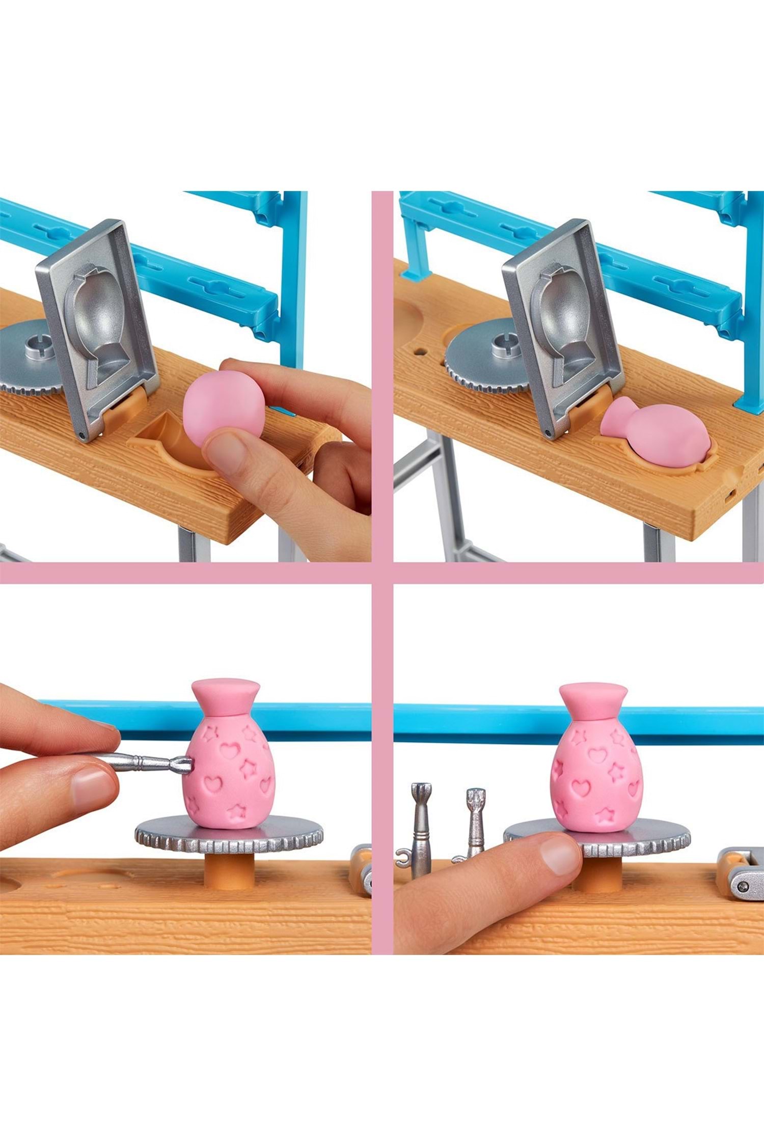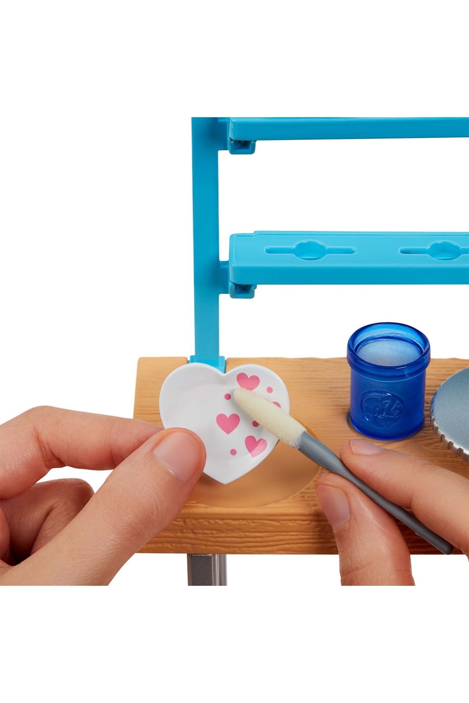 Barbie'nin Sanat Atölyesi'nde Barbie ile eğlenin! Çocuklar, çömlek ve resim yaparken rahatlamayı öğrenecek! Barbie oyun hamurunu kaptan çıkararak başlayın ve top haline getirin. Oyun hamurunu vazo kalıbına yerleştirin. Bastırın ve yeni eserinizi hazırlayın. Vazoyu platforma yerleştirip bir damga seçin (kalpler veya yıldızlar). Platformu çevirerek oyun hamurunu şekillendirin ve bitirdiğinizde eserinizi rafa yerleştirin. Sünger fırçayı "soğuk suya" batırın ve beyaz renkli parçaları boyayarak başyapıtınızı oluşturun: Küçük domuzun sırtına mavi benekler koyun, kalp şekilli tabağa pembe kalpler yerleştirin, ayıcığın gözlerini mora boyayın. Eserlerinizi rafa yerleştirin ve keyifle sergileyin! Çocuklar oyun hamuruyla tekrar tekrar oynayarak yaratıcılıklarını konuşturabilir. Barbie, şövalesinde iki renkli tuvalden birine resim yapıyormuş gibi de davranabilir. Oyun seti bükülebilir dizli Barbie ve 25'ten fazla yaratıcılık parçası içerir: şövale, 2 adet resim, sandalye, 4 adet resim kovası, 2 adet Barbie oyun hamuru kabı, 3 adet dekorasyon aracı, 1 adet sünger fırça, 1 adet ressam paleti, 3 adet renk değişimi sergi parçası ve 7 ek sergi ve hikâye anlatımı parçası. Bebek tek başına ayakta duramaz. Renkler ve süslemeler çeşitlilik gösterebilir. 3 yaş ve üzeri için uygundur. Barbie'nin Sanat Atölyesi ile çocuklar çömlek ve resim yaparken farkındalık kazanmayı ve rahatlamayı öğrenecek. Barbie oyun hamurunu kaptan çıkarıp top haline getirin ve ardından vazo kalıbına yerleştirin. Bastırın ve yeni eserinizi hazırlayın. Vazoyu dekore etmek için platforma yerleştirip damga seçin (kalpler veya yıldızlar) ve ardından platformu çevirerek oyun hamuruna şekil verin. Çocuklar, oyun hamuruyla tekrar tekrar oynayarak yaratıcılıklarını konuşturabilir. Ayrıca çocuklar sünger fırçayı "soğuk suya" batırıp üç beyaz renkli parçayı boyayarak başyapıtlarını oluşturabilir: Küçük domuzun sırtına mavi benekler koyabilir, kalp şekilli tabakta pembe kalpler yerleştirebilir, ayıcığın gözlerini mora boyayabilirler. Barbie, şövalesinde iki renkli tuvalden birine resim yapıyormuş gibi de davranabilir. Bükülebilir dizli Barbie ve 25'ten fazla yaratıcılık parçası içerir: şövale, 2 adet resim, sandalye, 4 adet resim kovası, 2 adet Barbie oyun hamuru kabı, 3 adet dekorasyon aracı, 1 adet sünger fırça, 1 adet ressam paleti, 3 adet renk değişimi sergi parçası ve 7 ek sergi ve hikâye anlatımı parçası.