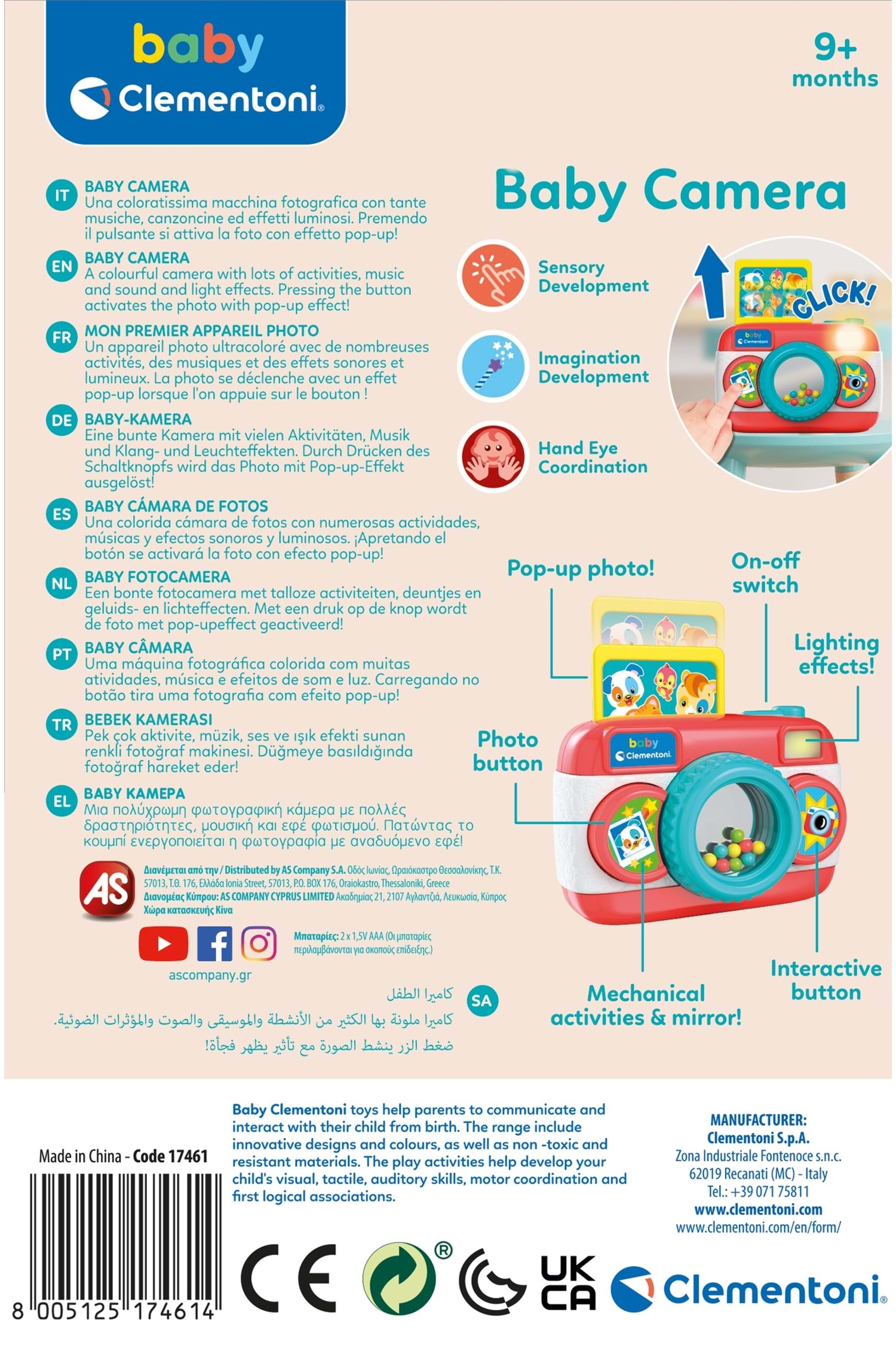 Deklanşöre her basıldığında sevimli melodiler veya eğlenceli hayvan sesleri çalan, en küçük detayına kadar özenle tasarlanmış canlı renkli ve tasarım odaklı bir kamera. Sesler veya şarkılar çalan ve bebeklere oyalayıcı etkileşimli oyun deneyimlerinde yol gösteren renkli tuşlarıyla onları sürekli yeni biçimlerde uyarır. Ses efektlerine, müziğe ve flaştan çıkan ışığa ek olarak, sadece bilişsel becerileri değil, aynı zamanda da ince motor becerileri geliştiren küçük fiziksel etkileşimlere yönelik fırsatlar da sunmaktadır. Her bir tuş, etkinlik ve malzeme, oyuncağı bebek için daha kolay ve ilgi çekici hale getirecek şekilde dikkatle tasarlanmıştır. Deklanşöre basıldığında ses efektleri, müzik ve hayvan resimleri gösteren, açılma efektli bir fotoğraf ortaya çıkar. Kameranın objektifi canlı renkli misketleri olan ve bebeğin ilgisini çekerek onlara perspektif ve derinlik kavramlarını tanıtan küçük bir ayna içerir. Bu birinci kalite ve tamamen emniyetli ürün, dikkatle oluşturulmuş detaylardan, titizlikle tasarlanmış etkinliklerden ve özenle seçilmiş renk şemasından da anlaşılacağı üzere tamamen İtalyan tasarımıdır.