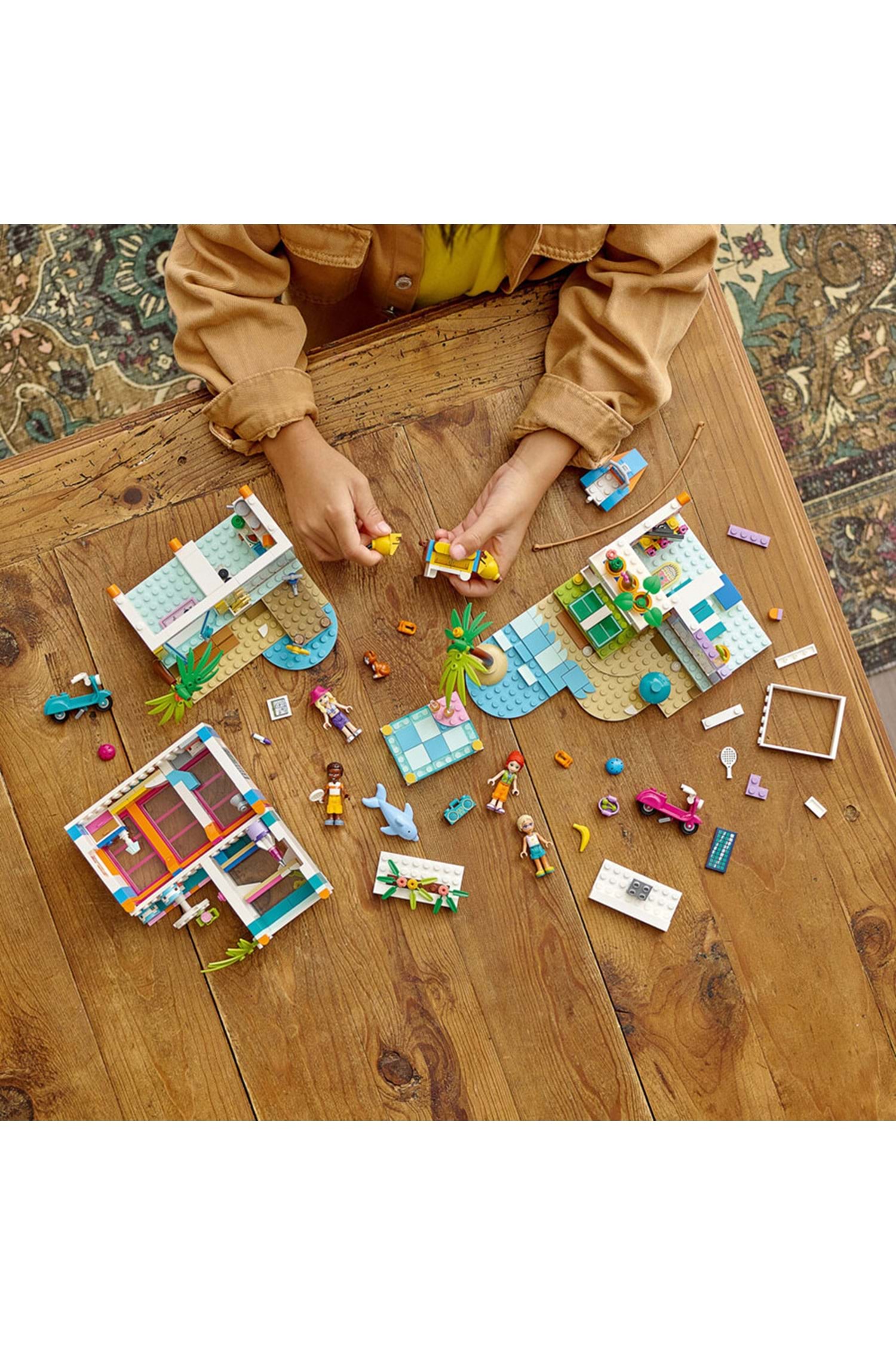 Lego Friends Harika vakit geçireceğiniz Yazlık Eve dalın. Buzdolabını yiyeceklerle doldurmak için elektrikli motosikletinizle şehir merkezine gidin. Eve döndüğünüzde kendinizi enerjik hissediyorsanız Mia ile masa tenisi oynayın. Değilseniz terastaki havuzda dinlenin. Yüzerek jet skiye gidin ve şişme muza atlayın. Sıkı tutunun… Ya da tutunmayın çünkü düşmek, eğlencenin yarısı!; • Yaratıcılığı hemen başlatın – Modüler LEGO Friends Yazlık Ev (41709) oyun seti, çocuklara saatlerce eğlence sunarak modellerini istedikleri gibi 2 ya da 3 ayrı binaya ayırmalarına olanak tanır; • Oyunla dolu – Banyolu bir yatak odası, ranzalı bir oda, balkon ve teras havuzu, çekyatlı bir oturma odası, mutfak, 2 elektrikli motosiklet ve bir şişme muz bulunur; • 6 karakterli LEGO Friends hediyesi – Yazlık Ev (41709), LEGO Friends Mia dahil 4 mini bebek ile yunus ve kedi figürleri içerir; • Yaratıcı aksesuarlar – Oyun kumandalarından masa tenisine ve şişme muzu şişirmek için kullanılan pompaya kadar, hayal gücüne dayalı oyunları harekete geçirmek için bir sürü aksesuar var; • 7 yaş ve üzeri çocuklar için eğlenceli doğum günü hediyesi – Evcilik oynamayı veya plaj temalı oyunları seven bir çocuk tanıyor musunuz? Bu renkli yaz oyuncağı, tatil oyunlarını seven erkek ve kız çocukları mutlu edecektir; • Esnek boyutlar – 2 katlı bir ev olarak yapıldığında yüksekliği 18 cm, genişliği 26 cm’dir ama çocuklar bu eğlenceli, yaratıcı, modüler hediyeyi yeniden düzenledikçe boyutları da değişir; • Eğlence ve arkadaşlık dünyası – Çocukları, en iyi zamanın arkadalarla geçtiğini öğrendikleri Heartlake City dünyasıyla tanıştırın; • Yüksek kalite – LEGO Friends setleri, güvenli bağlantılar ve sağlam modeller sağlamak için katı sektör standartlarına uygundur; • Güvenlik garantili – Yeni LEGO oyuncakları, katı global güvenlik standartlarına uygun olduğundan emin olmak için maksimum derecede test edilir;